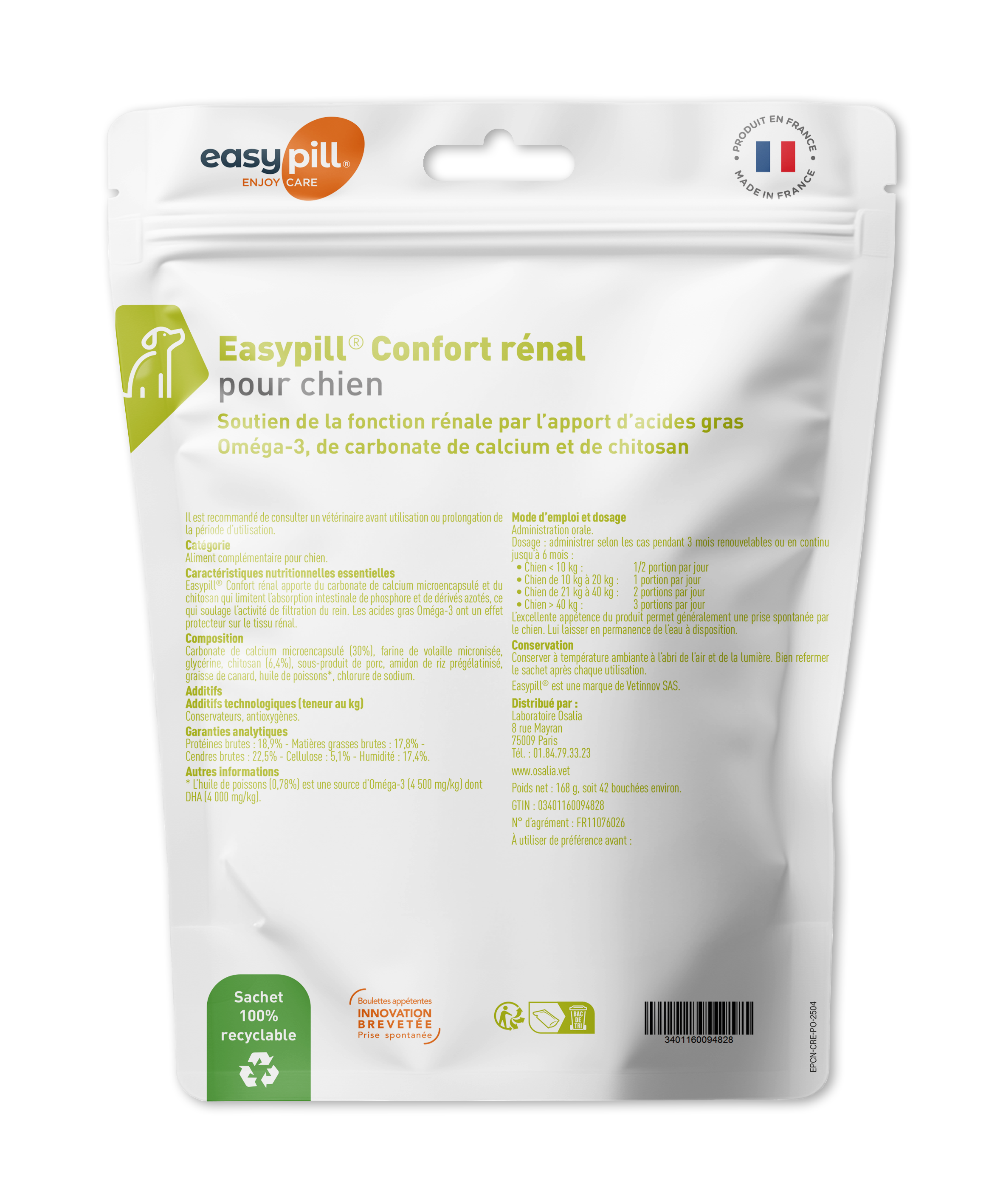 Chien | Soutien de la fonction rénale par l’apport d’Oméga 3, de carbonate de calcium et de chitosan |