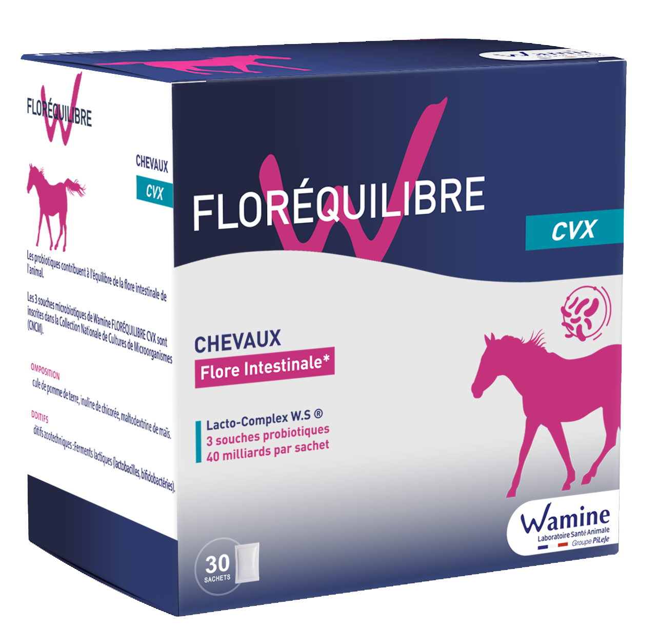Floréquilibre CVX contribue à restaurer l'équilibre du microbiote digestif perturbé des équidés lors de toutes situations de stress (prise d'antibiotiques, changement de ration, stress environnemental….)