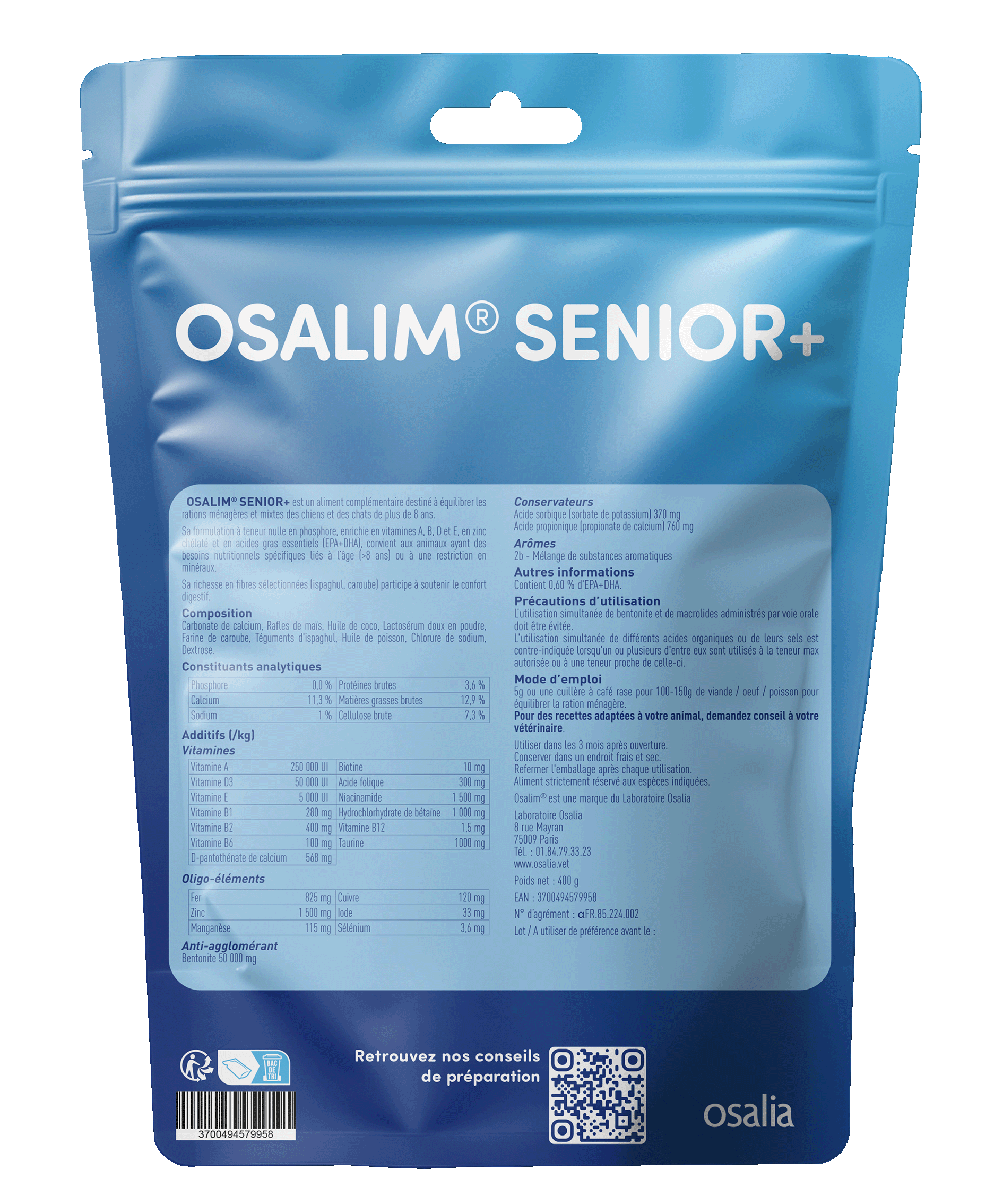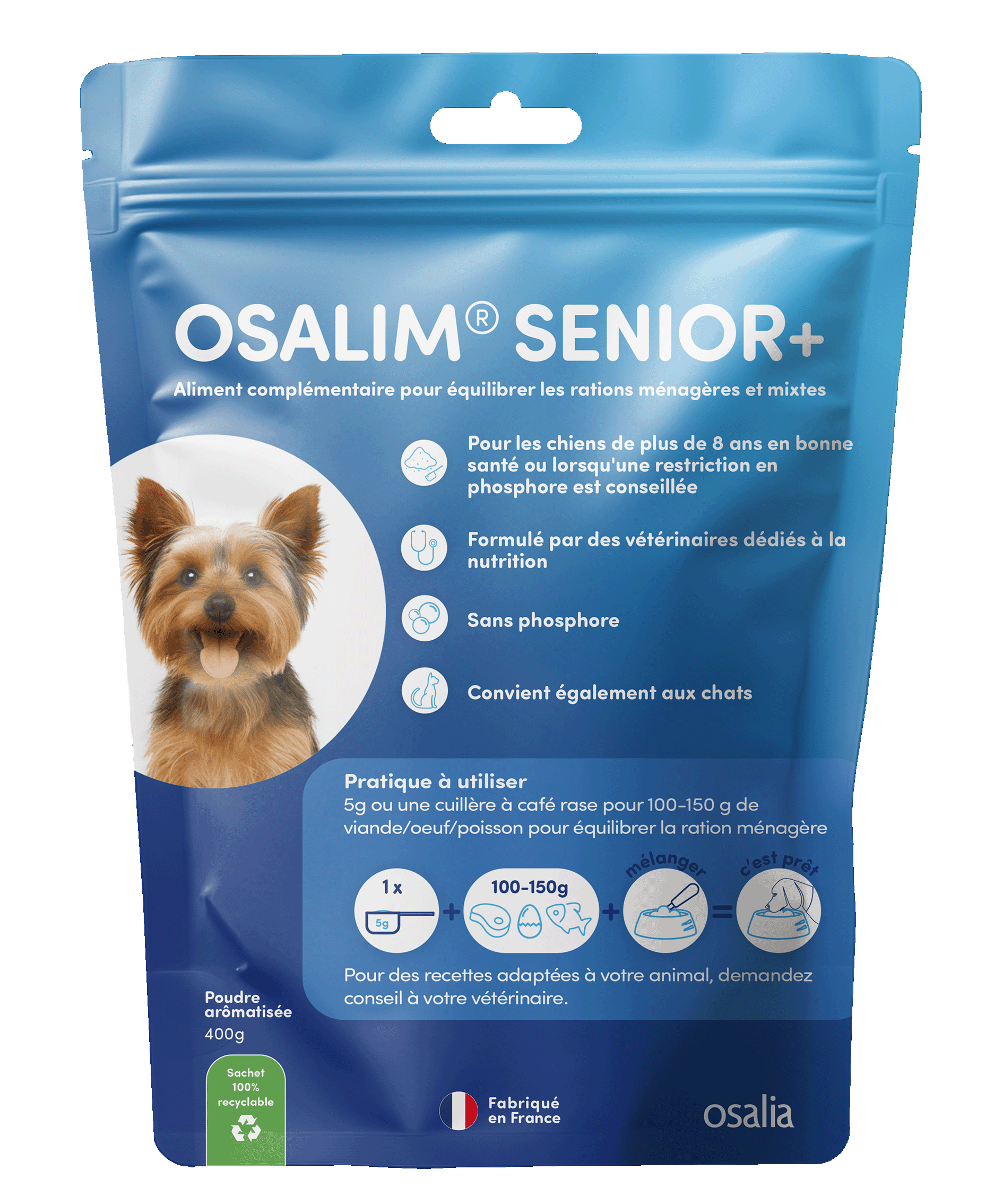 ChienChienne | OSALIM® SENIOR+ est un aliment complémentaire destiné à équilibrer les rations ménagères et mixtes des chiens et des chats de plus de 8 ans. |