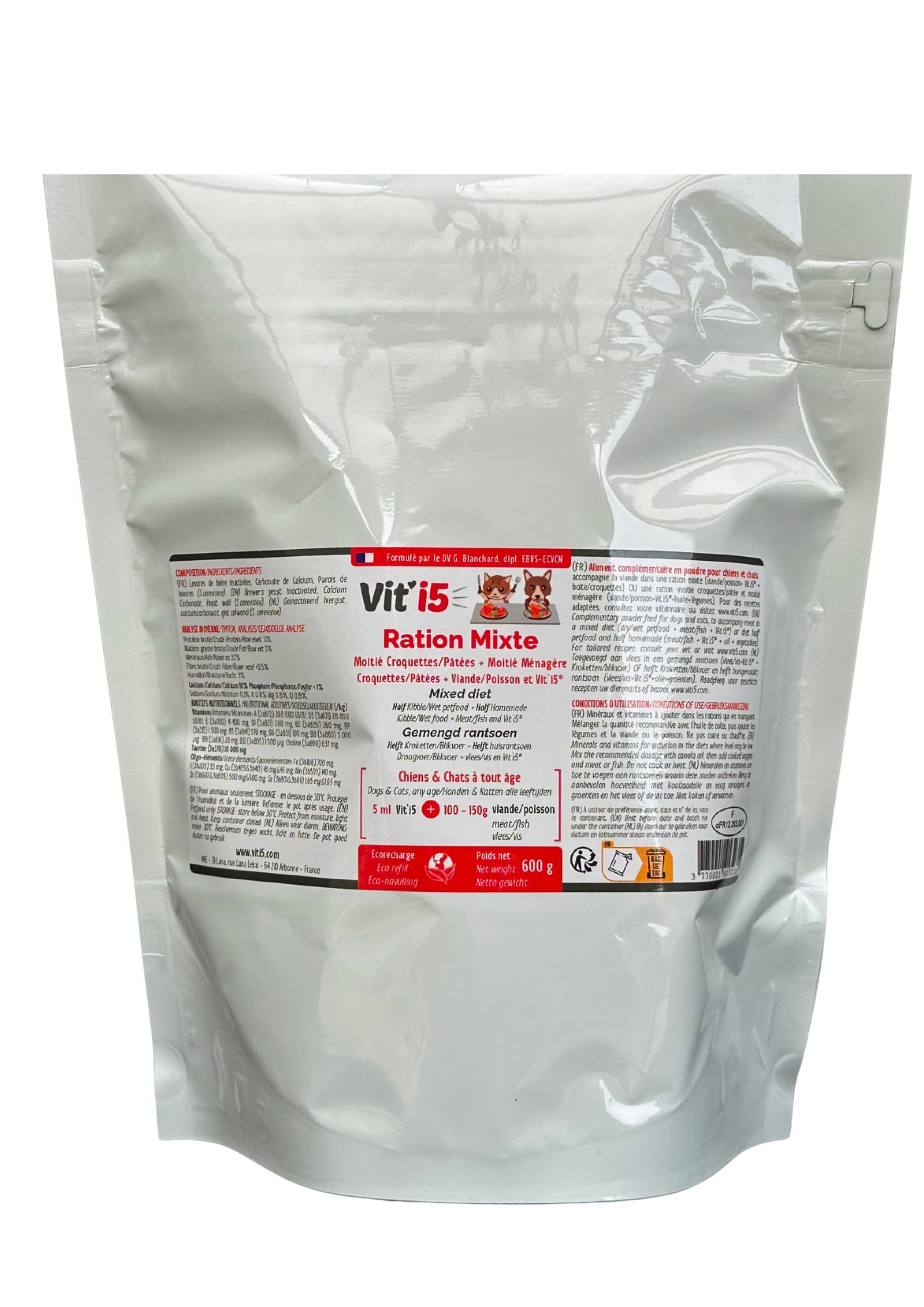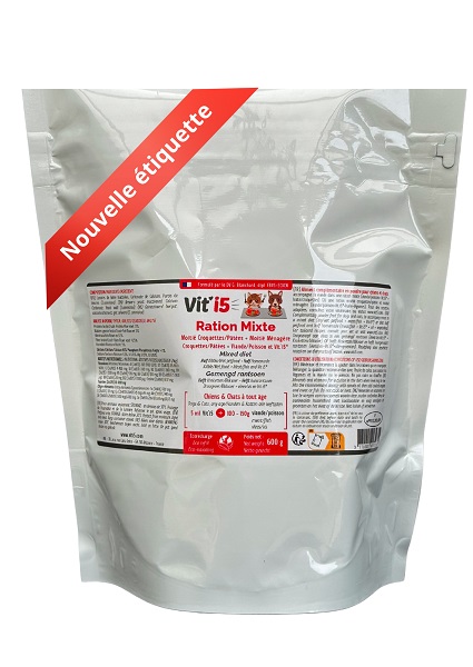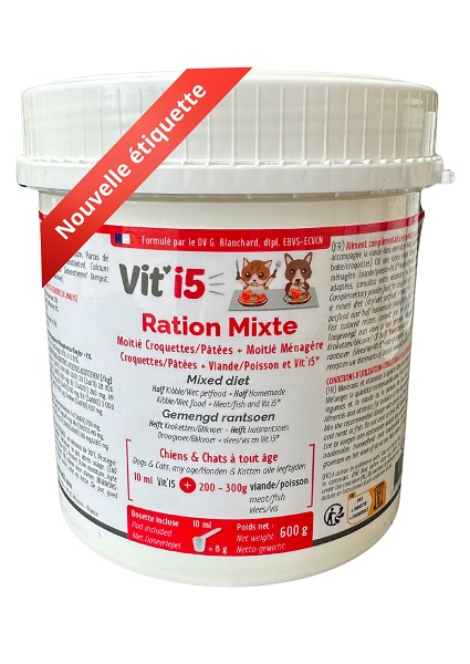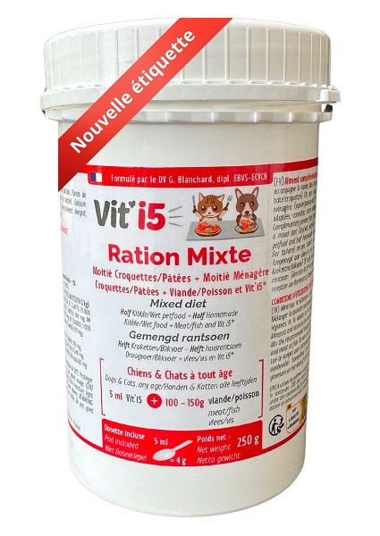 Mélanger chaque jour la quantité de Vit’i5® recommandée avec la viande ou le poisson ou mélanger avec l'huile, puis ajouter légumes et viande/poisson.