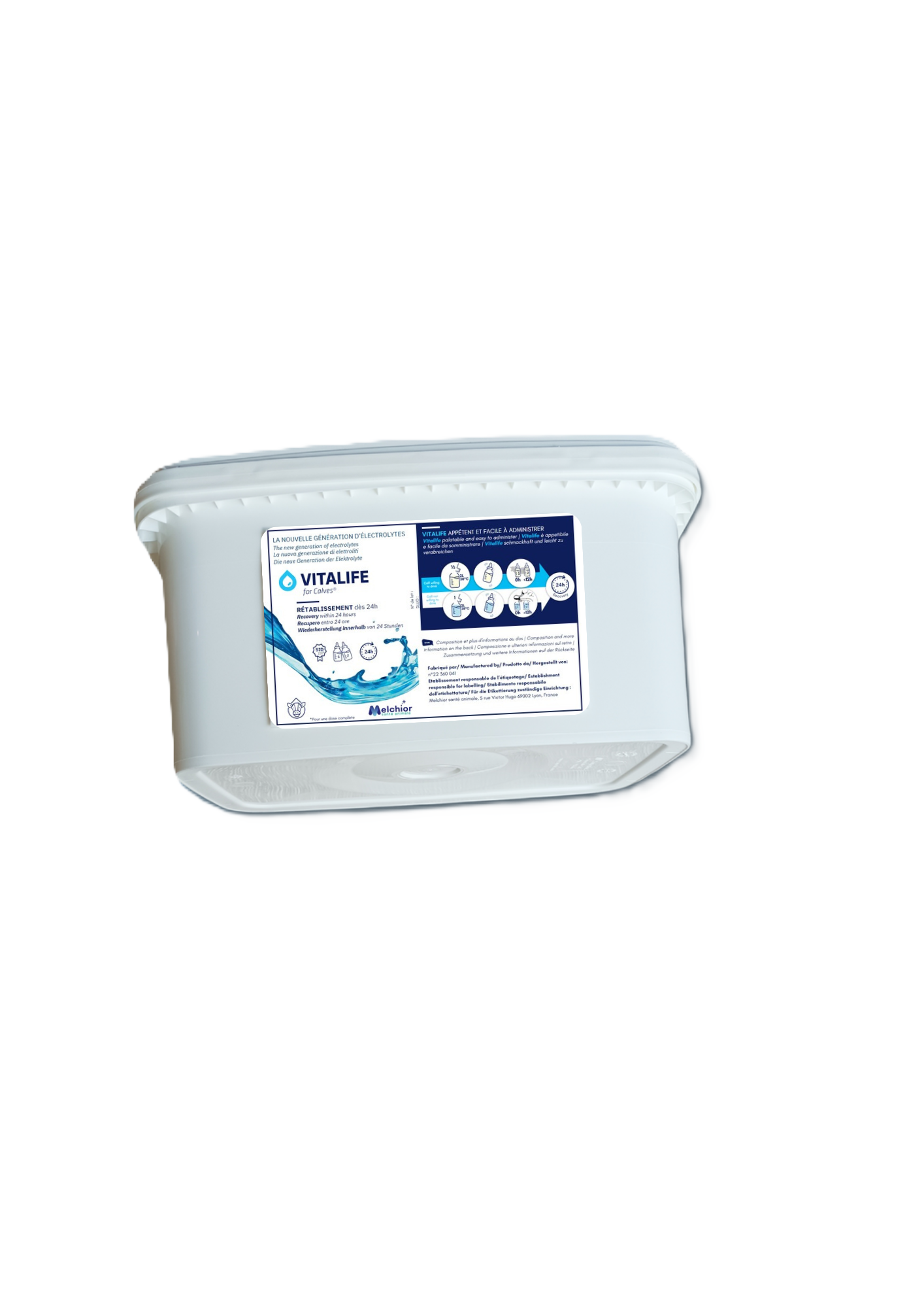 Préparer une solution fraîche en complétant le contenu du pot avec de l’eau. Remplir jusqu’au repère et bien agiter. Verser la moitié du contenu dans un biberon et compléter jusqu’à 2L avec du lait à 38°C. Donner le biberon au veau. Répéter l’opération 12 h plus tard avec le reste du pot qui aura préalablement été conservé au frais.