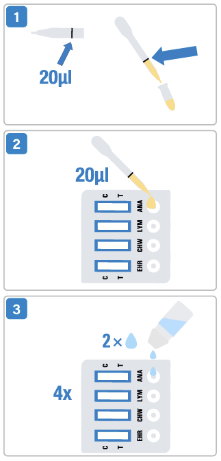 - Illustration 3 : Prenez le flacon de réactif ouvert et déposez 2 gouttes de réactif sur les quatre champs d’échantillons. Après quelques secondes, le liquide commence à couler sur la bandelette.