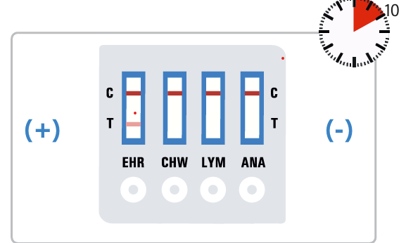 En cas de résultat positif, deux lignes rouges sont visibles dans le champ d’évaluation de la cassette de test pour chaque bandelette de test. La ligne supérieure (ligne de contrôle) confirme le bon déroulement du test ; la ligne inférieure (ligne de test) indique la détection de l’antigène ou des anticorps. Même une ligne de test faible doit être considérée comme une preuve positive.