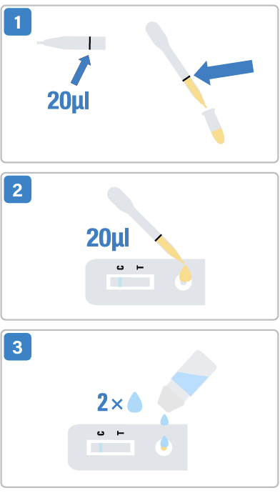 - Illustration 1 : Avec la pipette marquée de 20 μl, prélevez l’échantillon jusqu’à la marque de 20 μl.