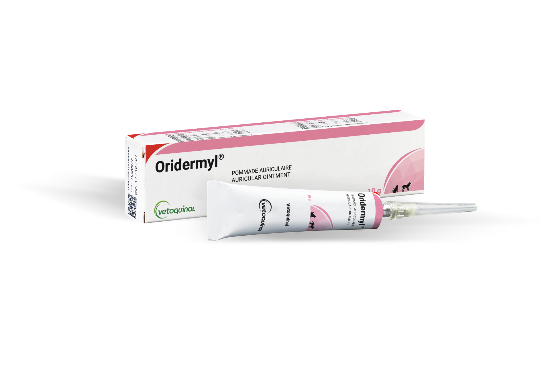 Après avoir nettoyé le conduit auditif, y introduire un pois de médicament vétérinaire puis masser délicatement la base de l'oreille. Nettoyer le surplus de médicament vétérinaire au niveau du pavillon.