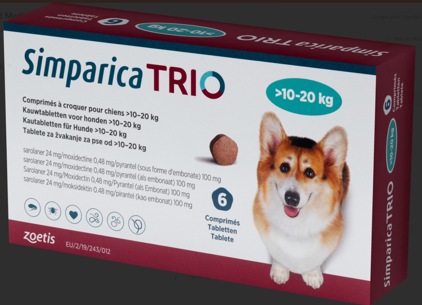 | Boîte de 6 comprimés - Simparica Trio pour chiens >10–20 kg | 05414736045238 | EU/2/19/243/012 | 9/17/2019 | Soumis à prescription | Non |